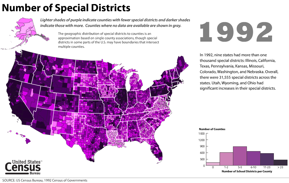 This animated visualization was created to accompany a data release for the 2012 Census of Governments. Viewers will notice that the number of special districts increases over time throughout the country, particularly in California. The histogram does double duty as both a description of the distribution at a national level and a legend.